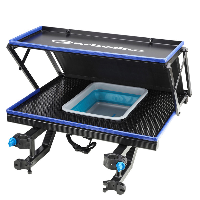 Ein Modell mit abnehmbarer Öffnung und perforierten Aluminiumplatten ermöglicht einen einfachen Zugang zu Zubehör. Die obere Ablage ist klappbar, um die Aufbewahrung der wichtigsten Ausrüstung zu optimieren, während die integrierbaren Elemente das Hinzufügen von abnehmbaren Haltern ermöglichen, was noch mehr Vielseitigkeit bietet. Kompatibel mit D25, D30 und D36 Stationen, ist diese Ablage eine Innovation von Garbolino, die für Wettkampfangler entwickelt wurde.