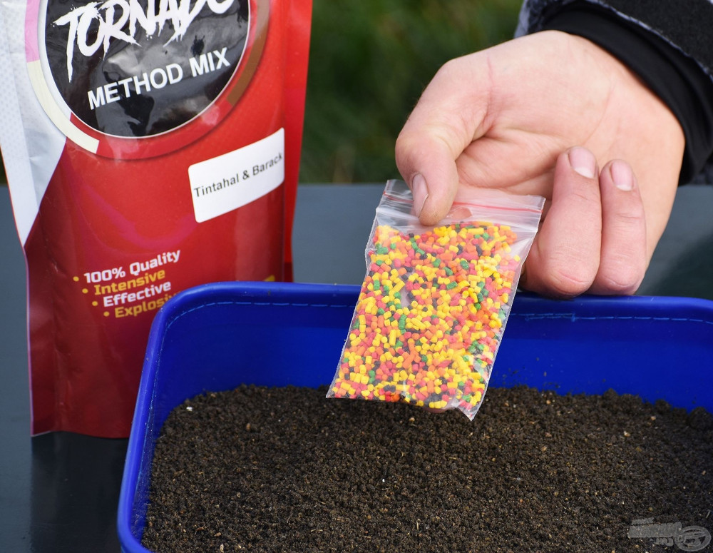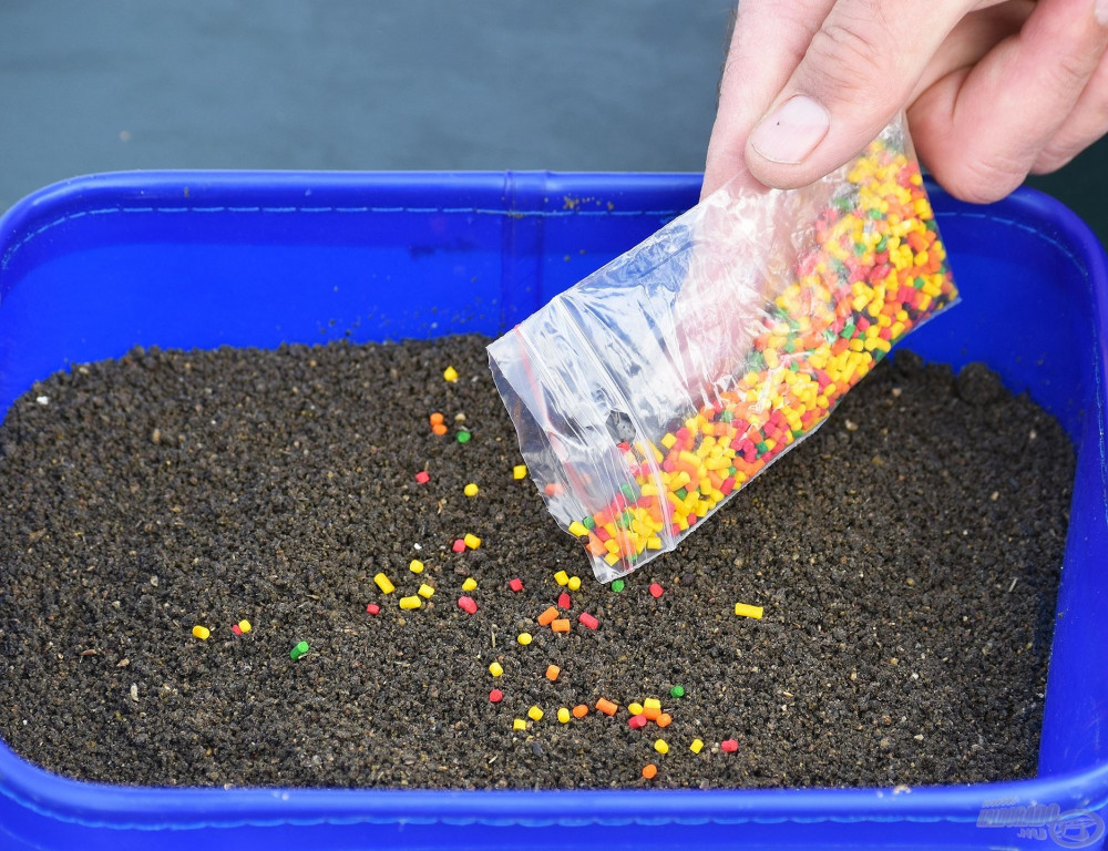 In jedem Beutel befindet sich ein kleines Tütchen mit bunten, aromatisierten kleinen Pelletkörnern. Der Angler kann dies dem Grundfutter entsprechend dem Appetit der Fische dosieren. Es gibt Orte, wo Karpfen so empfindlich beißen, dass jedes farbige Körnchen abschreckend wirkt, während es an anderen Orten den Appetit steigert. Wir überlassen es den Anglern, ob sie dies verwenden oder nicht!