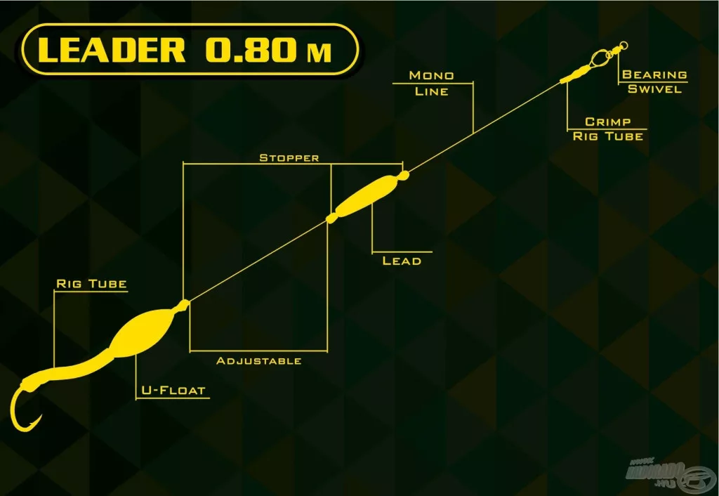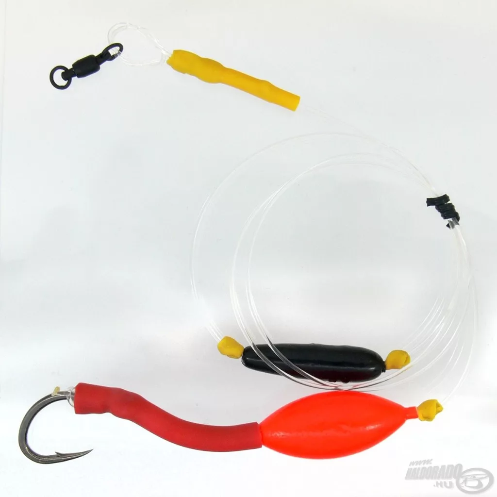 Dieses Vorfach kann eine ausgezeichnete Lösung für Situationen sein, in denen Welse nicht in der Nähe des Gewässergrunds, sondern im Mittelwasser oder nahe der Wasseroberfläche fressen. Am effektivsten sind wir, wenn wir mit diesem Vorfach einen Weichköder anbieten. Das Vorfach ist so konzipiert, dass der Köder dank der verwendeten Materialien nicht in den Schlamm einsinken kann; er schwebt stets in der von uns eingestellten Höhe. Die Gesamtlänge des Vorfachs beträgt 80 cm.