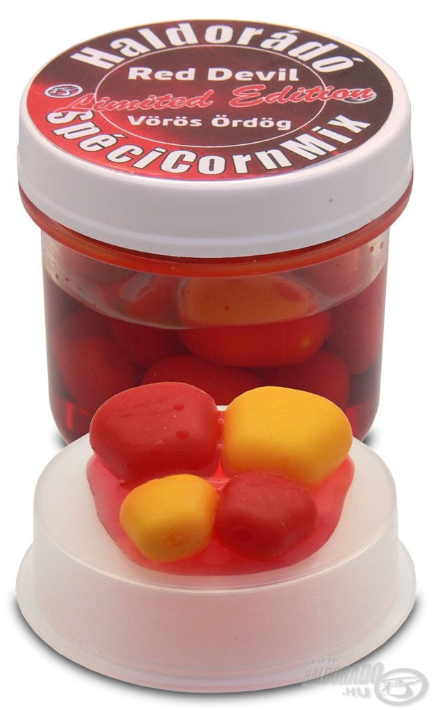 Der Packungsinhalt: Haldorádó SpéciCorn Mix Limited Edition Red Devil 16 Stk./Dose 10-15mm Gummimais