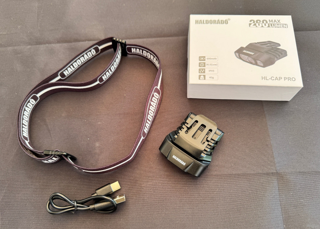 Der Packungsinhalt:Haldorádó HL-Cap Pro Stirnlampe