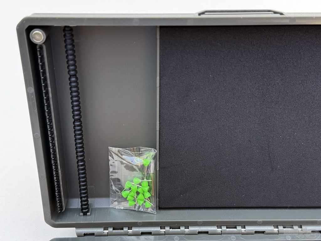 – Die andere Seite ist ein mit EVA-Schaumstoff ausgekleideter Vorfachhalterbereich, der perfekt zur organisierten und sicheren Aufbewahrung gebundener Haken-Vorfächer ist. Die Vorfächer können mit den mitgelieferten Stecknadeln befestigt werden.
