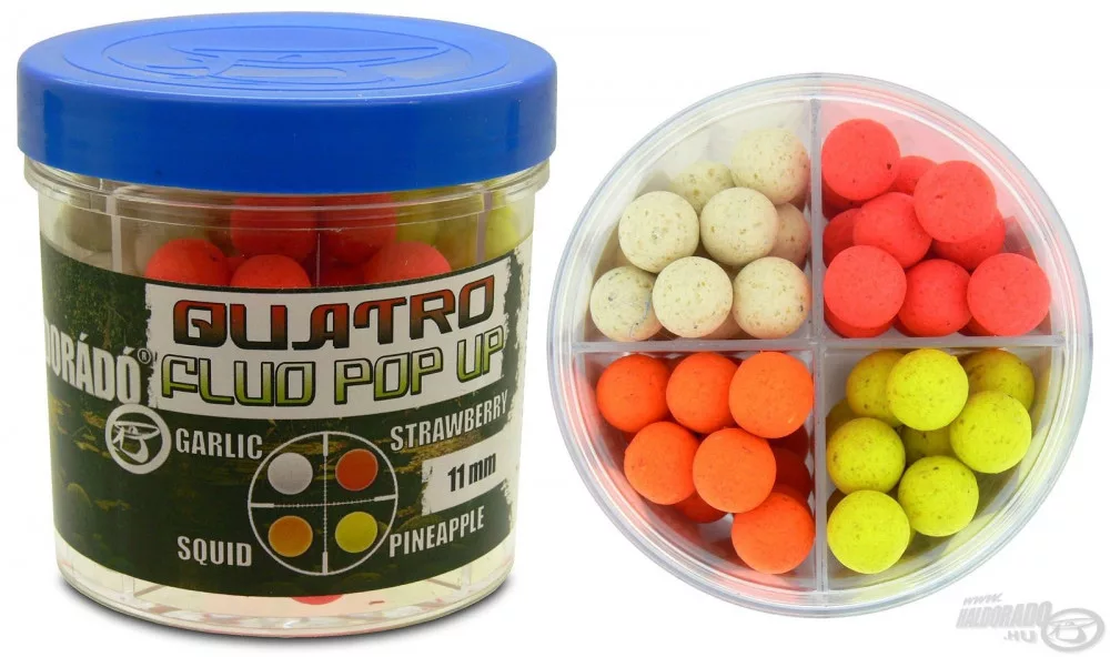 Es ist unbestreitbar, dass schwebende oder leicht gemachte „Schneemann“-Köder bei den meisten Angelarten fängiger sind als am Grund liegende, daher dürfen sie in keiner Karpfenangeltasche fehlen. Wir sehen aber auch, dass die meisten bereits nicht mehr in der Lage sind, 4-5 weitere Köderarten mitzunehmen. Mit der Quatro-Familie haben wir auch dieses Problem gelöst, denn mit dem Kauf einer einzigen Box erhalten unsere Kunden 4 verschiedene – Garlic (Knoblauch), Strawberry (Erdbeere), Squid (Tintenfisch) und Pineapple (Ananas) – aromatisierte, sehr fängige schwimmende Köder. Alle vier Varianten werden in Fluo-Farben hergestellt und sind separat in den Boxen untergebracht. Wir bieten sie in 8, 11 und 14 mm Varianten an, damit jeder die für seine Methode am besten geeignete Ködergröße wählen kann. Alle davon sind gekocht, d.h. in diesen Fällen sprechen wir nicht von löslichen Schwimmködern.