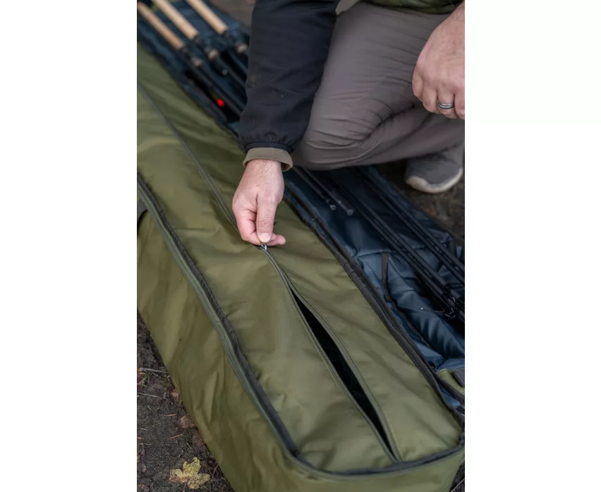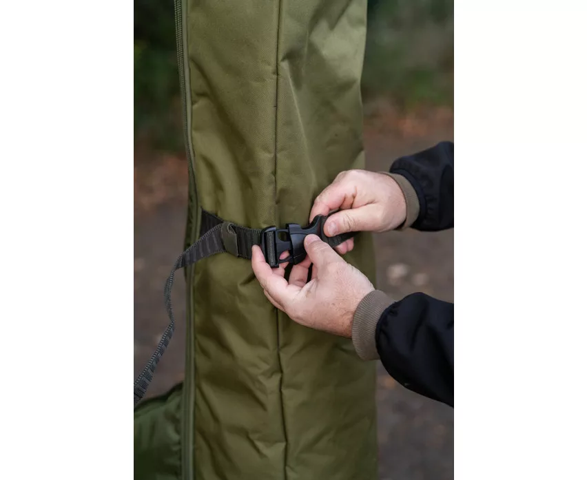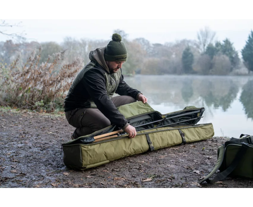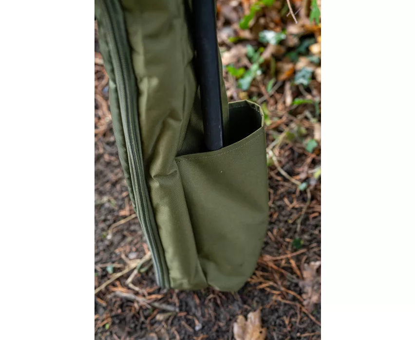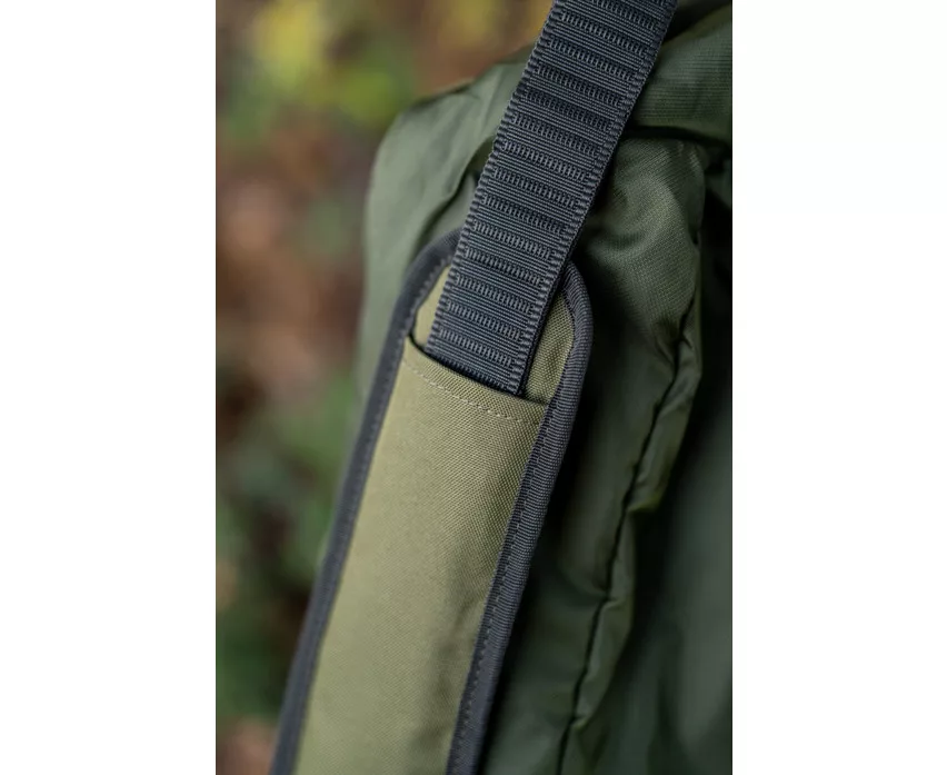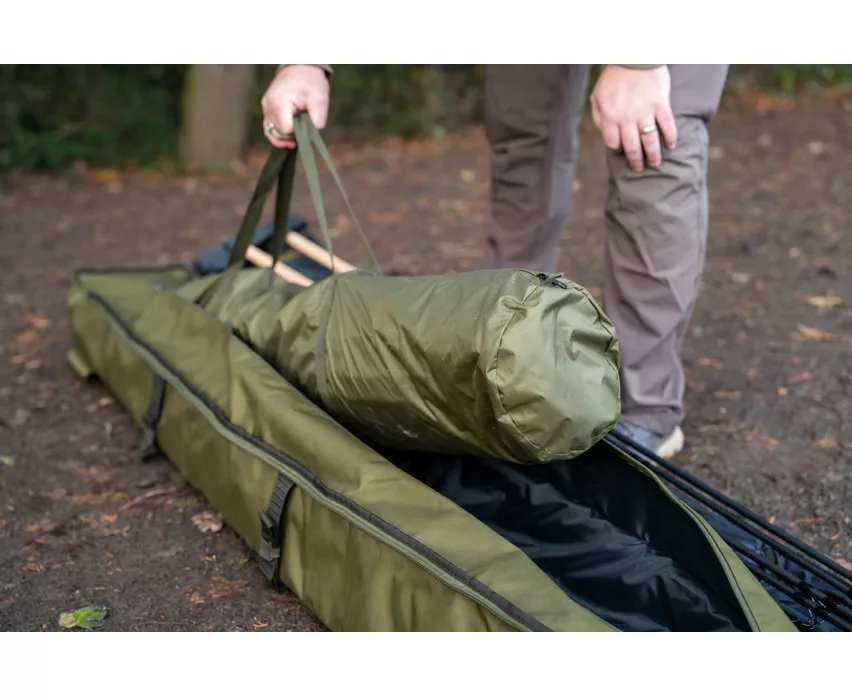 Eine innovative, neue Methode, um montierte Ruten und Rollen zusammen mit Zelten, Brollys und anderer Angelausrüstung zu transportieren. Das Fach für die Ruten wird durch einen Gelenkbügel vom hinteren Zeltbereich ferngehalten, wodurch alle Vorteile eines sicheren Rutenfutterals zum Schutz der Ruten gewährleistet werden. Der ausreichend große, gepolsterte Bereich ist für die bequeme Unterbringung von Ruten und Rollen konzipiert, sowie ein größerer hinterer Stauraum, in den alle Korum Zelte oder Brollys passen. Es enthält auch eine einfache Außentasche für Kescherköpfe, Kescherstangen oder Banksticks. Es gibt auch eine Außentasche und einen Gurt für nasse Ausrüstung, wie Zelte, Stativ und Netze. Mit abnehmbarem und verstellbarem gepolstertem Schultergurt für bequemen Transport. Jede Tasche hat folgende Eigenschaften: