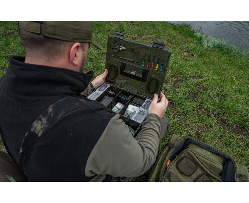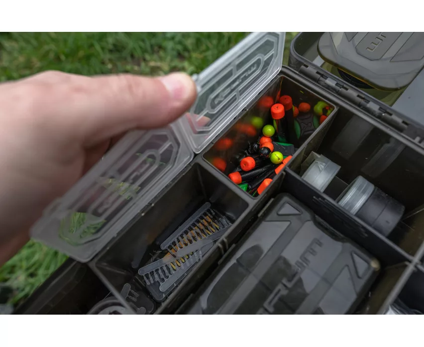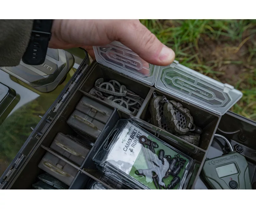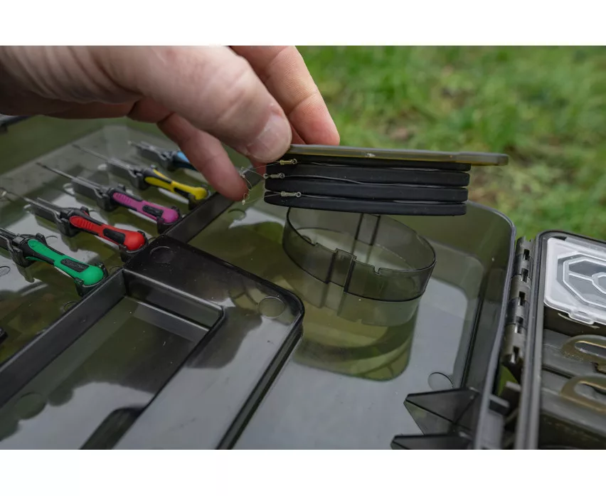 Der Innenraum besteht aus sorgfältig gestalteten Fächern: vier tiefe Staufächer, neun geteilte Bereiche mit herausnehmbaren Trennwänden sowie ein langes Ablagefach ermöglichen eine anpassbare Anordnung. Die Box enthält auch die wichtigsten Köderwerkzeuge: fünf Ti Ködernadeln, einen Hakenlöser (Disgorger), eine Schere sowie zwei Slim Rig Blox Vorfachhalter, die auf der Innenseite des Deckels untergebracht sind. Diese Vorfachhalter bieten Schutz für vorgebundene Vorfächer vor Witterungseinflüssen.