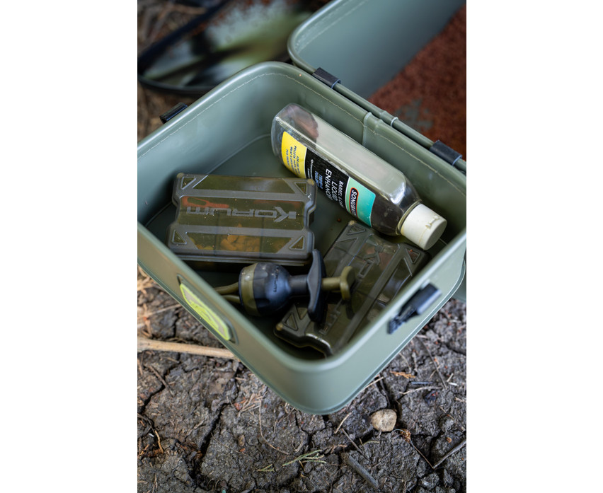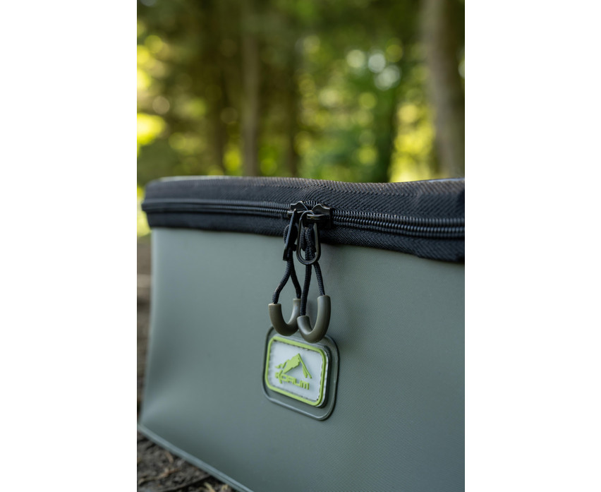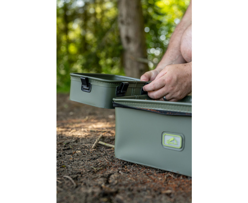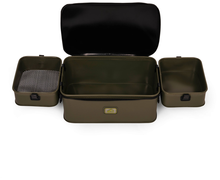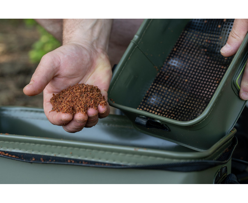 Die Tasche wird mit zwei Innenschalen geliefert, von denen eine mit einem 3 mm Netz ausgestattet ist, wodurch sie sich hervorragend zum Sieben von Lebendködern oder Futter eignet. Die Schalen können während des Gebrauchs von außen an den Rand der Tasche geklemmt werden, wodurch dem Angler eine größere Arbeitsfläche zur Verfügung steht, was besonders beim Anfüttern oder bei der Vorbereitung der Montage nützlich ist. Unter den Schalen ist ausreichend Platz für Köderbehälter, Hakenköder und andere Futtermittel, sodass alle wichtigen Utensilien griffbereit sind.