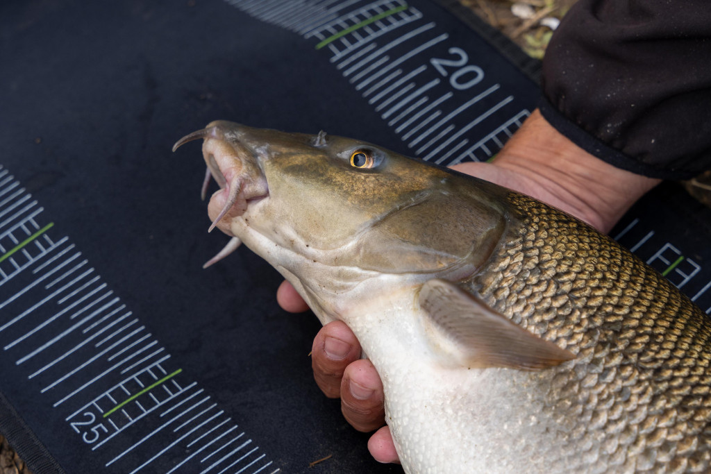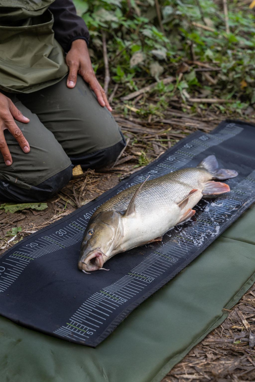 Wenn der kapitale Karpfen endlich im Kescher ist, ist es am wichtigsten, ihn vor dem Zurücksetzen sicher und schonend zu behandeln. Die Korum Neoprene Measure Mat Carp Mat wurde genau für diesen Zweck entwickelt und garantiert sowohl dem Fisch als auch dem Angler Ruhe.