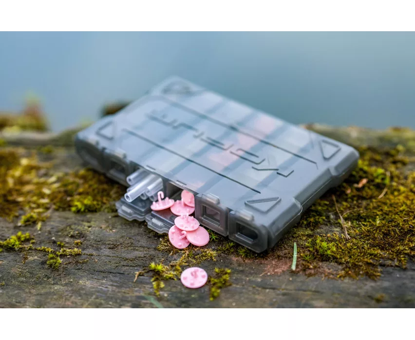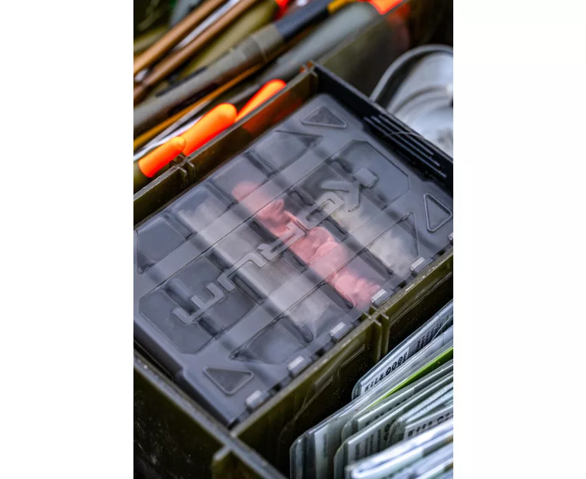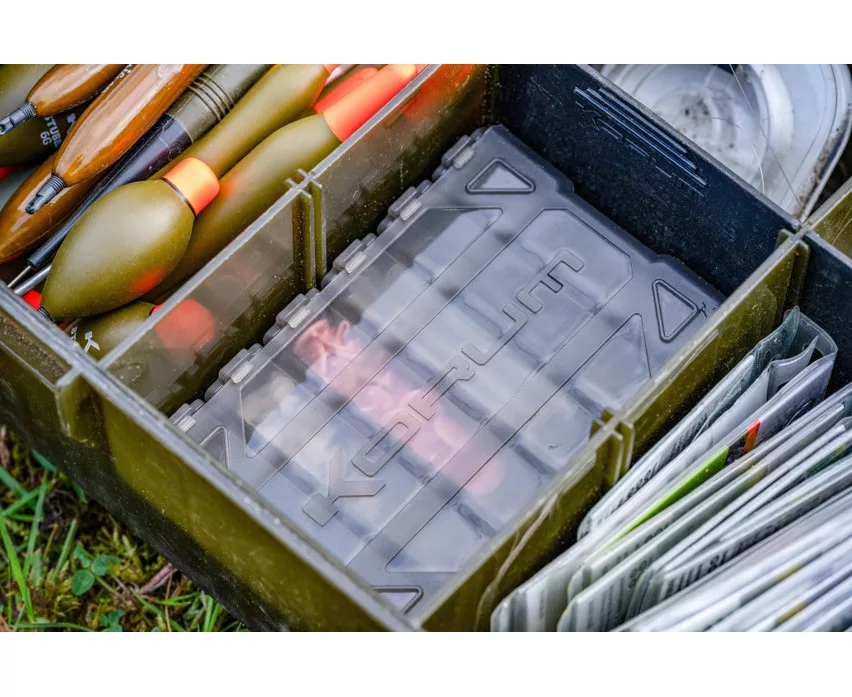 Die Box bietet eine praktische Alternative zur Beutelaufbewahrung: kleine Ausrüstungsteile können einfach in die Fächer geschüttet werden, sodass man nicht suchen oder separate Verpackungen öffnen muss. Die Innenaufteilung ist übersichtlich, die Größe der Fächer ist ideal für die am häufigsten verwendeten Kleinteile. Die Box ist Blox-kompatibel und lässt sich somit problemlos in andere Korum Aufbewahrungssysteme, wie z.B. Geräteboxen oder modulare Systeme, integrieren.