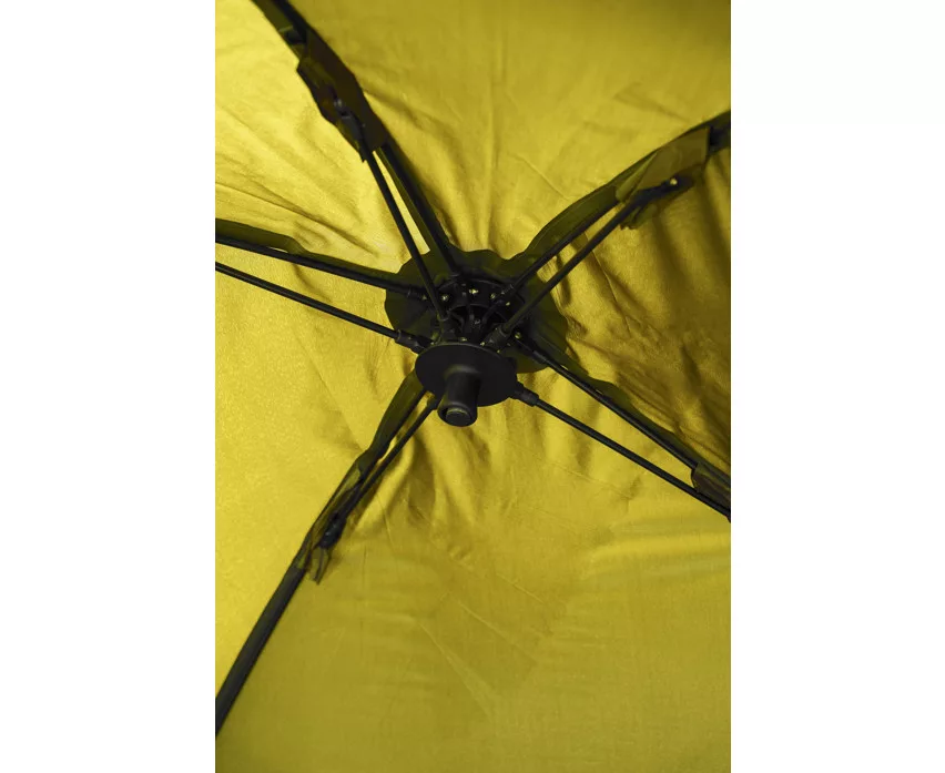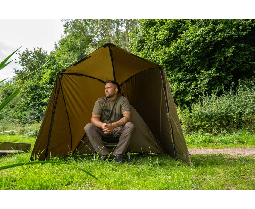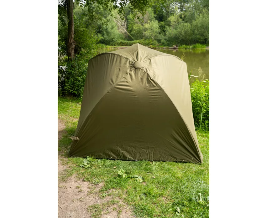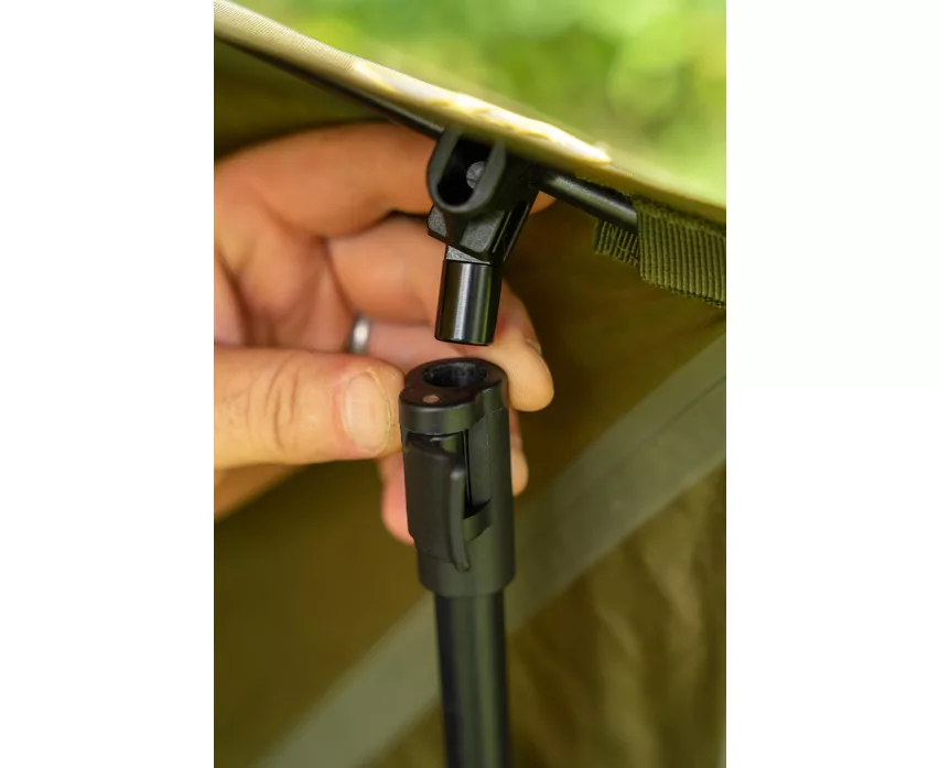 Das kurze Design des internen Rippen-Brolly-Systems bietet maximale Kopffreiheit, während der Aufbau einfach und schnell ist – es wird kein zentraler Mast benötigt. Mit den zwei mitgelieferten, schnell anschließbaren Sturmstangen kann der Schirm stabil im Boden verankert werden, wodurch er auch bei windigem Wetter zuverlässigen Schutz bietet. Die Höhe des Zeltes lässt sich mithilfe des einzigartigen Spannsystems leicht einstellen, sodass der Angler die Einstellung stets an die jeweiligen Bedingungen anpassen kann.