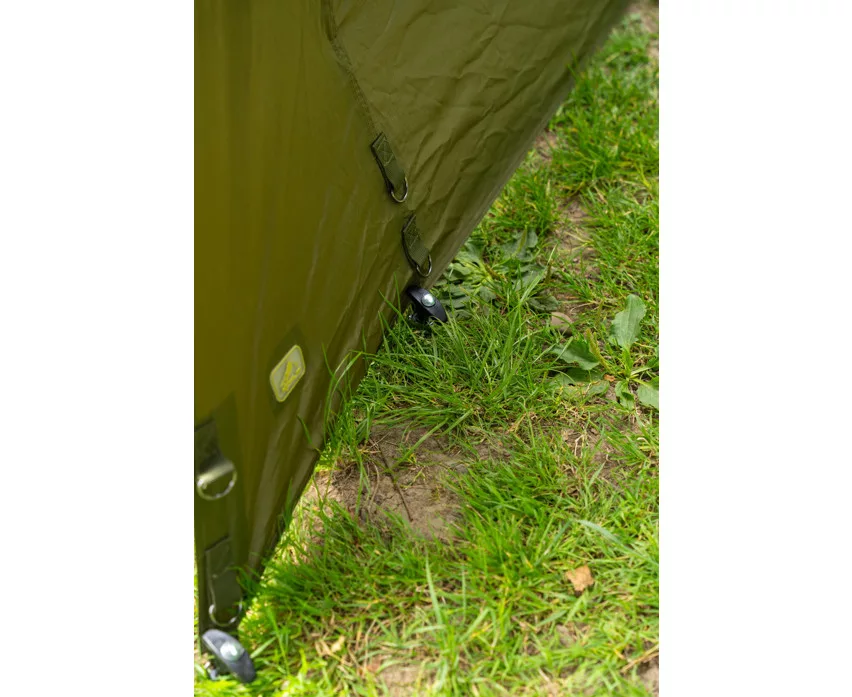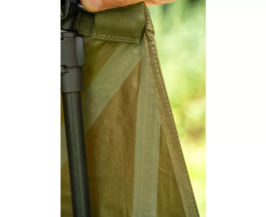 Die Zeltplane verfügt über mehrere Befestigungspunkte, die einen straffen, stabilen Aufbau in verschiedenen Höhen ermöglichen. Dies ist besonders nützlich, wenn die Geländebedingungen oder die Gegebenheiten des Angelplatzes variieren. Das Material des Schirms ist 150D PU Supa Lite Gewebe, das wasserdicht, leicht und strapazierfähig ist, wodurch es langfristig ein zuverlässiger Begleiter am Wasser ist.