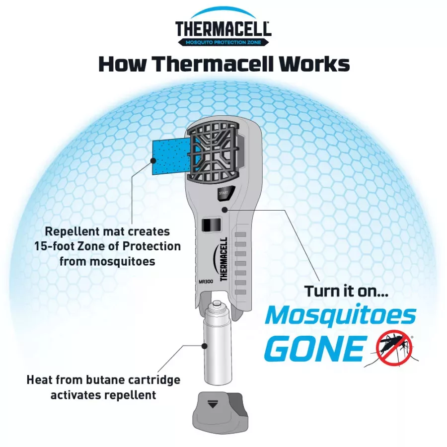Der Thermacell MR-300L ist ein tragbares Mückenschutzgerät, das einfach zu bedienen ist und stundenlangen, geruchlosen Mückenschutz auf einer Fläche von bis zu 21 Quadratmetern bietet.