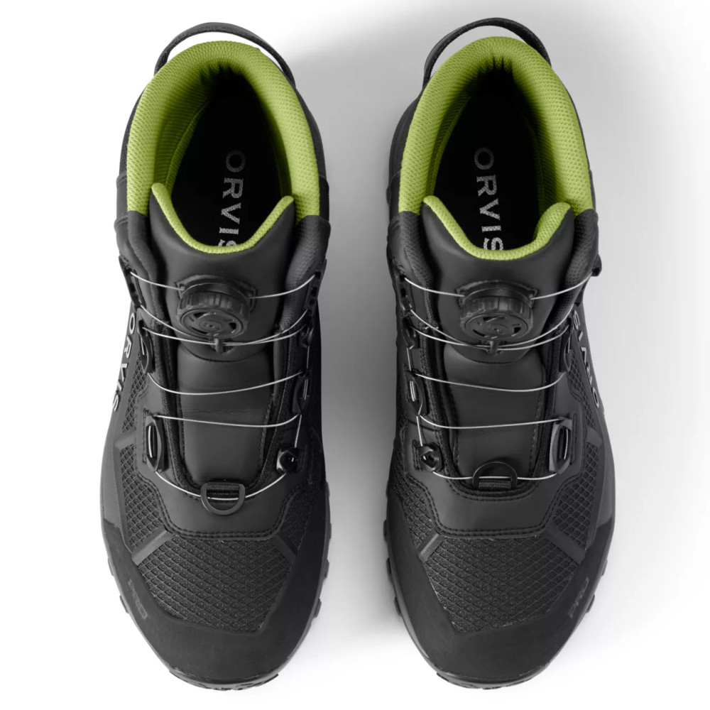 Dieses revolutionäre Sohlendesign ist ein erstaunlicher Fortschritt in der Branche hinsichtlich der Nasshaftung von Gummi. Die Michelin Outdoor Extreme Außensohle bietet 25 % bessere Abriebfestigkeit und 43 % bessere nasse Traktion im Vergleich zu Mitbewerbern. Durch die Anwendung der Michelin-Reifengeometrie wird eine breitere Aufstandsfläche für Stabilität, ein höherer Oberflächenkontaktanteil und ein Stollendesign, das Stöße reduziert und die Druckverteilung verbessert, erreicht. Die zweischichtige Zwischensohle verfügt über eine geformte ESS-Platte, die besseren Halt und Torsionsstabilität bietet. Orvis hat in Zusammenarbeit mit OrthoLite® die 3D-geformte X25-Einlegesohle entwickelt, die für hochintensive Sportarten konzipiert wurde und maximalen Komfort und Fußgewölbestütze bietet. Das branchenweit erste geformte schnell trocknende Clarino Mikrofaser-PU-Obermaterial eliminiert Nähte in abriebgefährdeten Bereichen und verbessert die Haltbarkeit drastisch für erhöhte Stabilität und extreme Abriebfestigkeit, ohne unnötiges Gewicht. Der Stiefel ist höher geschnitten für Knöchelunterstützung und mit geschlossenzelligem Schaumstoff gefüttert. Kratzgummi im Zehen- und Fersenbereich für Abriebfestigkeit, eine überdimensionierte Fersenlasche für einfacheres An- und Ausziehen und dicht gewebte Schnürsenkel reduzieren Schnürsenkelbruch. Das neue und verbesserte BOA Schnürsystem sorgt für gleichmäßige Spannung und erhöhten Komfort.