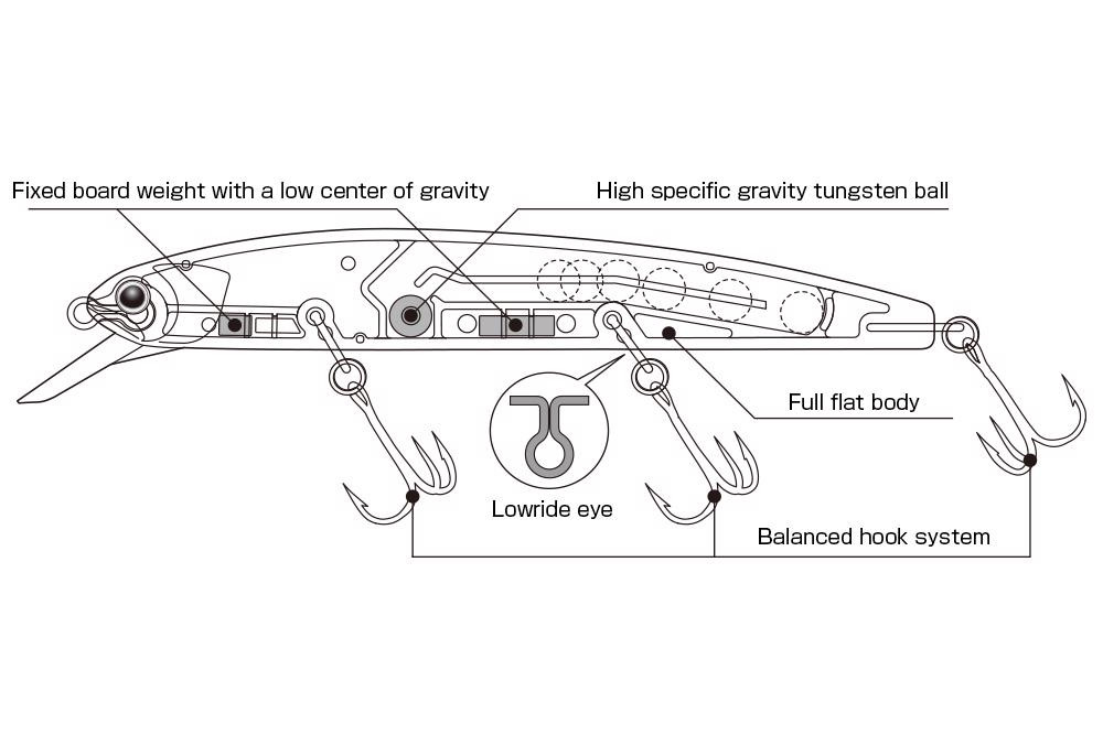 Zu den Änderungen gehört die Verstärkung der von hinten eingesetzten Tauchschaufel des Vorgängermodells, was eine dünnere Basis ermöglichte. Der in den Körper ragende Teil und das Gewicht des Haltematerials ergeben eine zusätzliche Masse, die eine tiefere Neigung nach vorne bewirkt. (Die aus einem Stück gegossene Tauchschaufel des neuen Modells verfügt über eine größere vordere Luftkammer, die eine horizontalere schwimmende Körperhaltung und einen besseren Geradeauslauf ermöglicht.) Durch ein flaches (plattenförmiges) Gewicht mit niedrigem Schwerpunkt und die Änderung der Form der Tauchschaufel ist der Köder zu einer scharfen, explosiven Jerk Bewegung und einer engen (Tight) Wobbler (Schlag) Aktion auch bei gleichmäßigem Einholen fähig.
