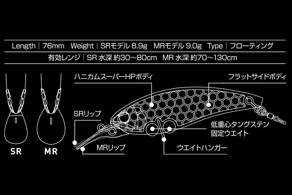 Die 76 mm Körpergröße passt perfekt zu den kleineren Futterfischen, die in der frühen Saison wandern, ist aber das ganze Jahr über universell einsetzbar. Ihre Größe ermöglicht es dem Ayu [der Zielfischart], ohne Misstrauen mutig anzugreifen. Ihr kräftiges Design sorgt für ausreichend Gewicht, sodass sie sowohl mit Spinning (Stationär-) als auch mit Baitcasting (Multiplikator-) Ausrüstung verwendet werden kann. Ihre stabile Flugposition und der feste Schwerpunkt ermöglichen bei Bedarf extrem weite Würfe.