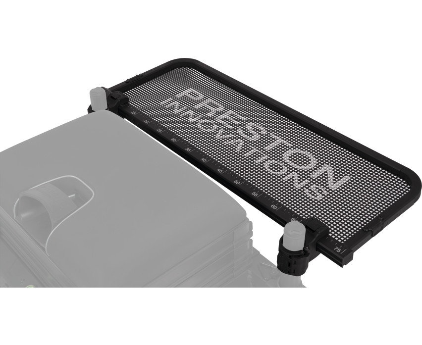 Der Boden des Trays besteht aus perforiertem Ventamesh-Blech, das eine ausreichende Belüftung für Köder und Futter gewährleistet, insbesondere bei warmem Wetter. Es dient auch als effektives Wasserabflusssystem, sodass Sie sich an regnerischen Tagen keine Sorgen machen müssen, dass Ihre Ausrüstung nass wird. Die verschiebbaren Befestigungsgelenke ermöglichen eine schnelle und stabile Montage, während die Kompatibilität mit einem Sonnenschutz zusätzlichen Schutz bei Sonnenschein bietet.