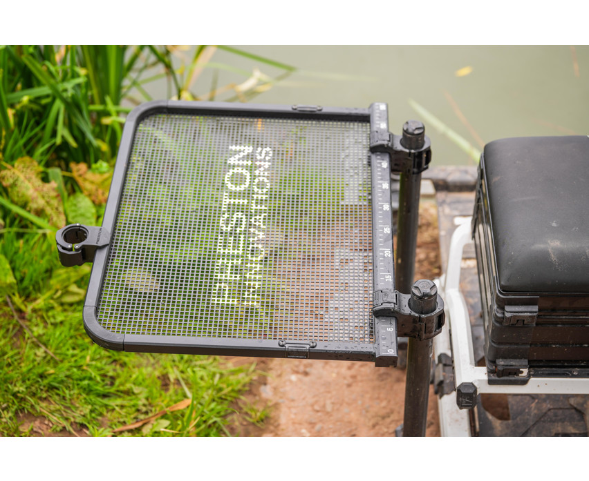 Für Feederangler ist es unerlässlich, dass ihre Ausrüstung schnell zugänglich und gut organisiert ist. Das Preston Ventalite Large Side Tray dient diesem Zweck: Es bietet eine stabile, gut belüftete, wetterfeste Arbeitsfläche, die das ganze Jahr über zuverlässig verwendet werden kann. Das Lochblech hilft, Wasser abzuleiten, so dass das Futter trocken bleibt, und das fußlose Design erleichtert die Positionierung auch auf engstem Raum.