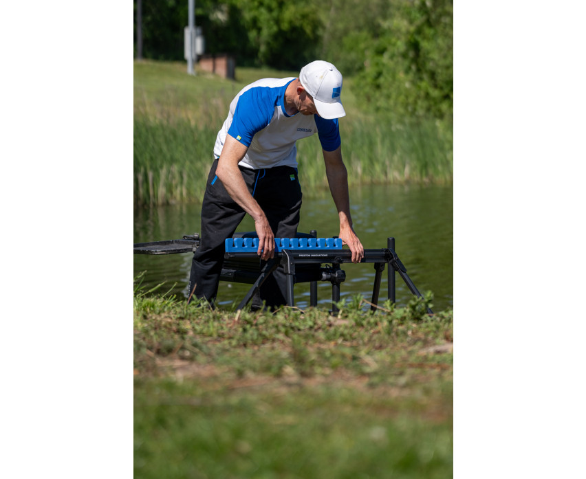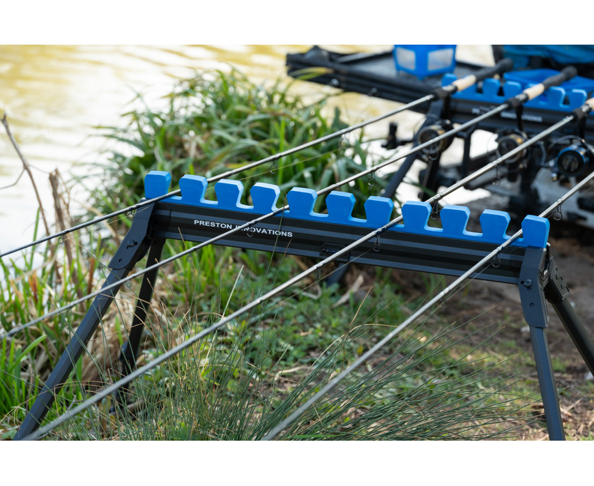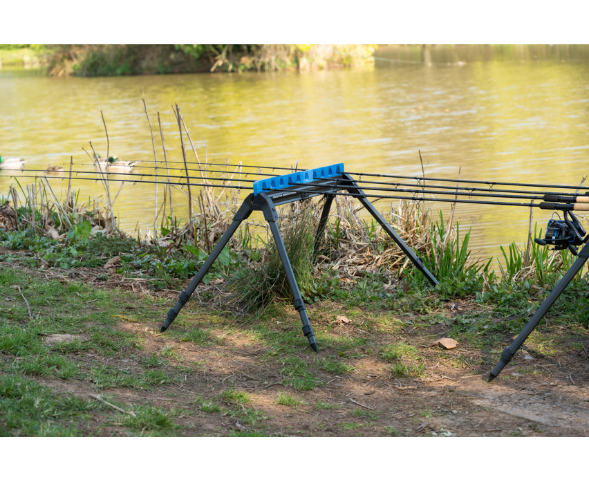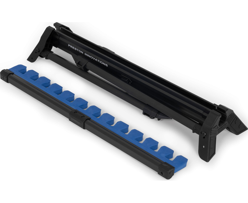 Der Halter ist aus robusten und dennoch leichten Materialien gefertigt, die die darin aufbewahrten Top-Sets langfristig vor Beschädigungen und äußeren Einflüssen schützen. Dank seines flachen Designs steht er stabil auf dem Boden, und die vier teleskopisch ausziehbaren Beine gewährleisten die Standfestigkeit des Halters auch unter variablen Geländebedingungen. Die verschiebbare Schaumstoffeinlage bietet zusätzlichen Schutz für die Ruten und verhindert deren Bewegung und Stöße während des Transports.
