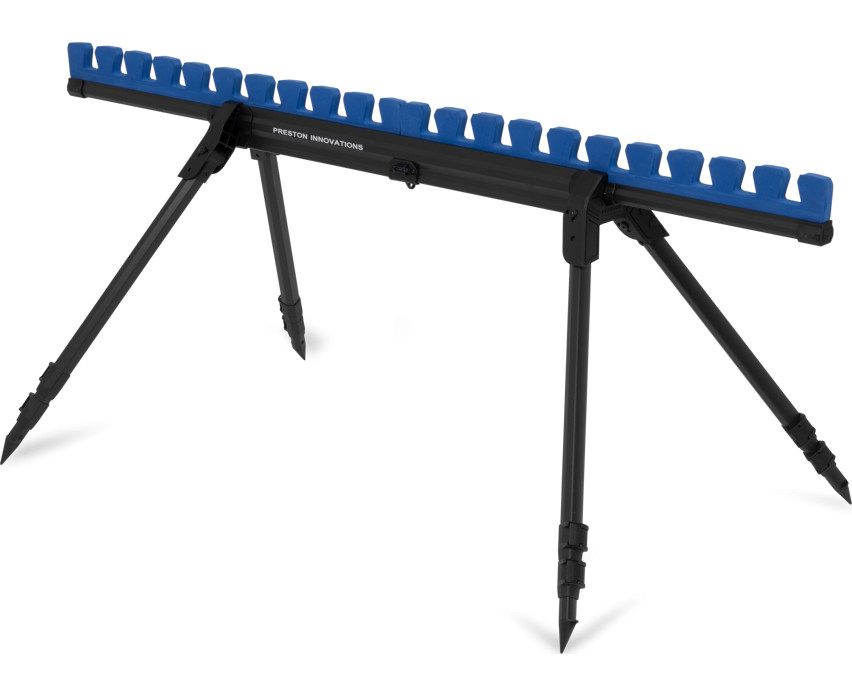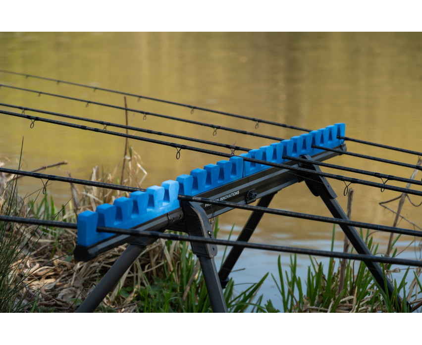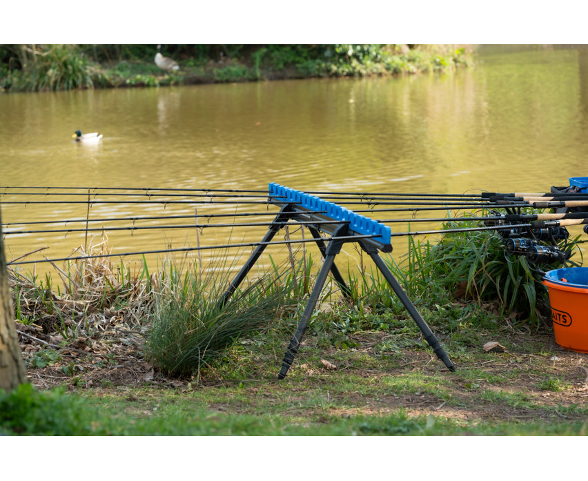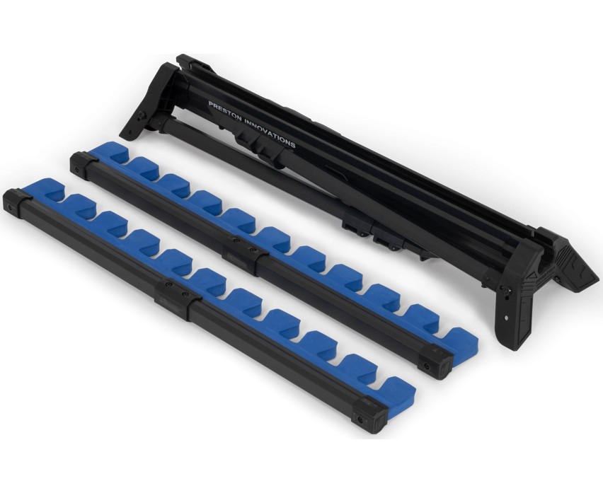 Die Halterung ist aus robusten, aber leichten und langlebigen Materialien gefertigt, die die darin aufbewahrten Ruten effektiv vor äußeren Einflüssen schützen. Das flache, stabile Design sorgt dafür, dass die Halterung nicht wackelt und leicht auch auf unebenem Boden platziert werden kann. Vier teleskopische, ausziehbare Beine erhöhen die Standfestigkeit, während die doppelt verschiebbare Schaumstoffeinlage zusätzlichen Schutz für die Kopfruten-Top-Sets bietet und Stöße und Bewegungen verhindert.