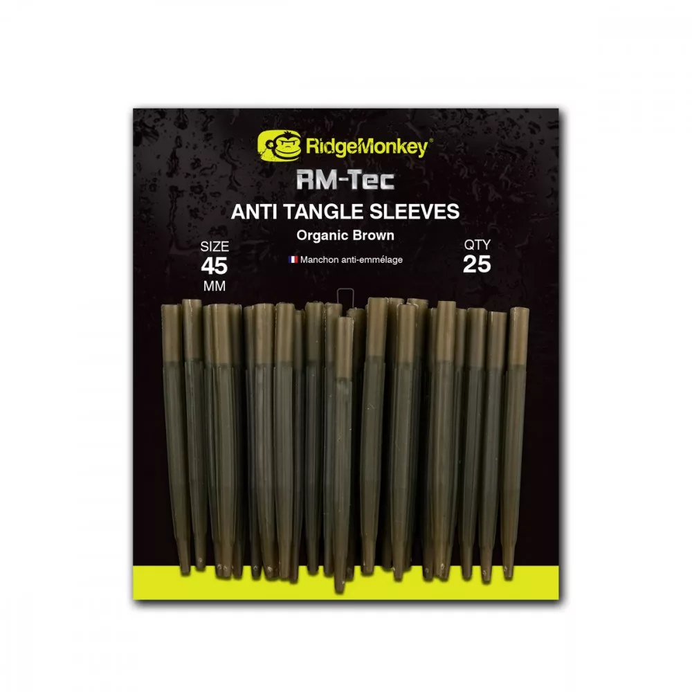 RidgeMonkey RM-Tec Anti-Tangle Gummischlauch - Der RidgeMonkey RM-TEC Anti-Tangle Schlauch verhindert, dass sich unser Vorfach beim Wurf verdreht und schützt gleichzeitig unsere Verbindung. Er ist ideal in Kombination mit einem Wirbel der Größe 8, gefertigt aus einem transparenten, halbsteifen Material. Erhältlich in einer wirtschaftlichen 25er-Packung. Erhältlich in zwei Größen und zwei Farben. Farben: Weed Green, Natural Brown Größen: 25mm, 45mm