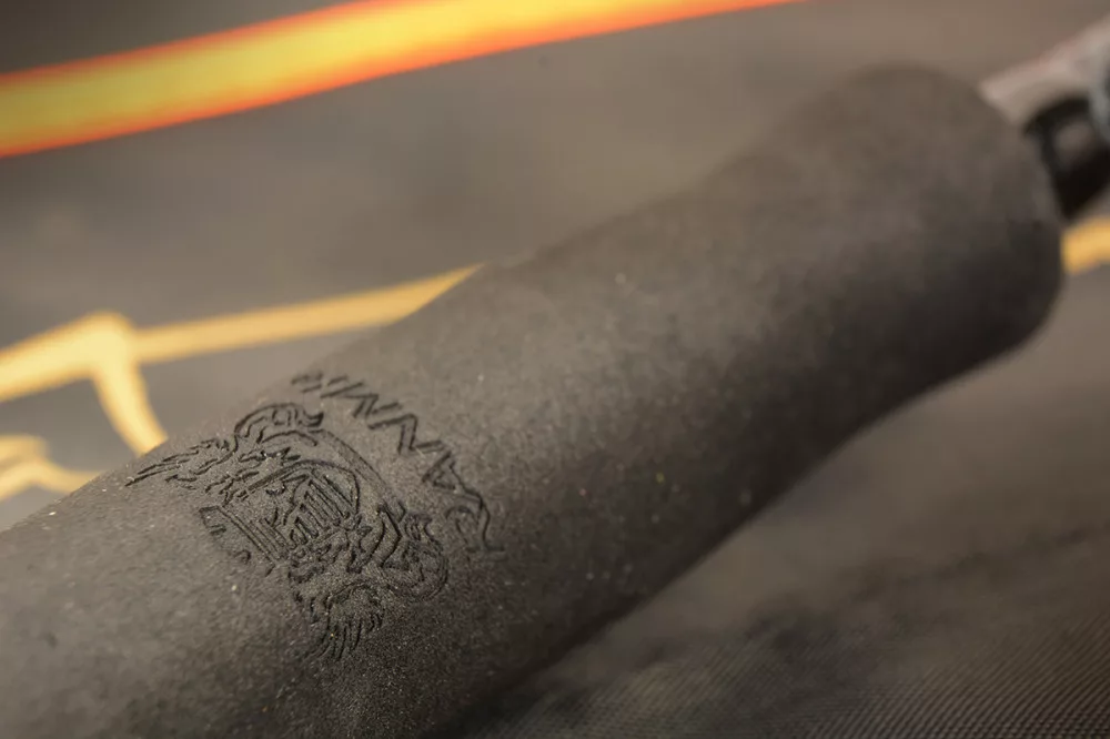 Der Blank ist mit ästhetischen goldenen Akzenten verziert und verfügt über einen von oben einschraubbaren, karbonverzierten Rollenhalter.