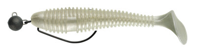 Der SWIMY GALFION FAT SHAD JIG ist ein klassischer Gummifisch mit flachem Körper, montiert mit einem Cheburashka-Kopf, der aus extrem weichem, aber gleichzeitig strapazierfähigem Material gefertigt ist. Um die Fängigkeit zu erhöhen, wurde das Material aromatisiert und sogar mit verschiedenen Attraktoren (Salz, Garnelenaroma) imprägniert, damit der Raubfisch ihn länger im Maul behält, um einen besseren Hakenbiss zu gewährleisten, bevor er den Trick bemerkt.