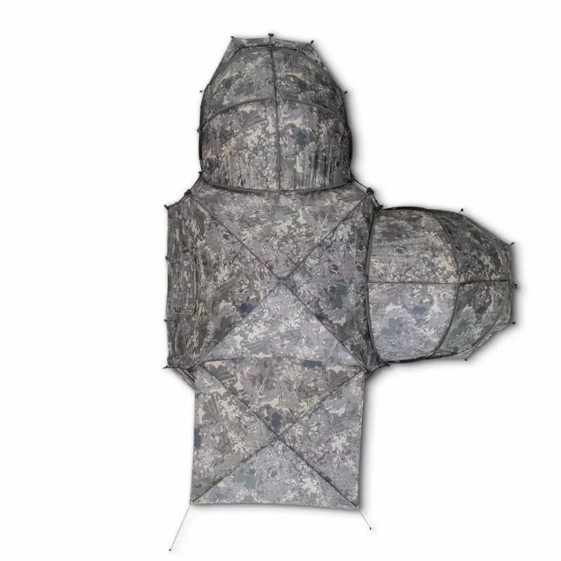 Das Gazebo Base Camp Camo Pro kann auch separat als zentrales Zelt oder als zentrales Element des modularen Base Camp Systems verwendet werden, indem geschlossene Kapsel-Zelte hinzugefügt werden, wodurch der Lagerplatz um Schlafräume erweitert werden kann.