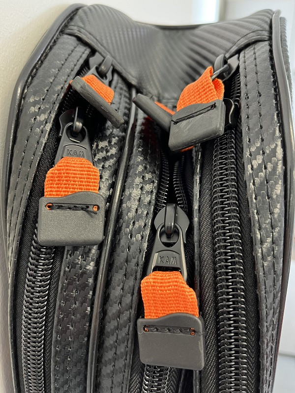 Stradivari 3-Fach steife Rutentasche in 160cm Länge. Hergestellt aus Carbon gemustertem, wasserdichtem Material und passenden goldfarbenen Riemen, eine hochwertige, schön verarbeitete Tasche mit starkem Reißverschluss und goldfarbenem Top Mix Logo. Perfekter Schutz für die montierten Ruten!